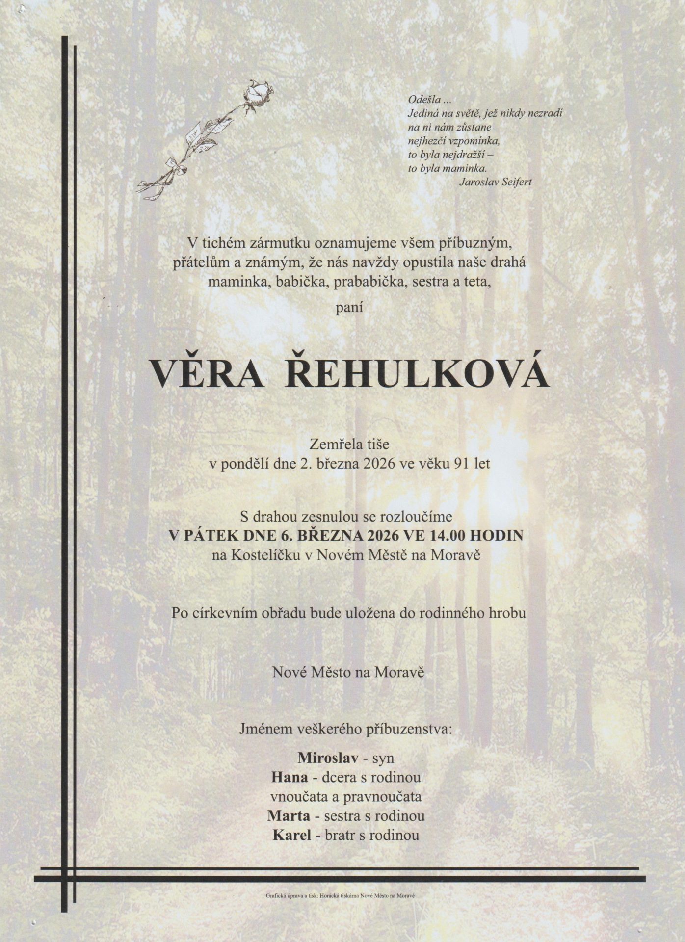 | 02.03.2026 | Věra Řehulková | Nové Město na Moravě | 91 let | Zobrazit |