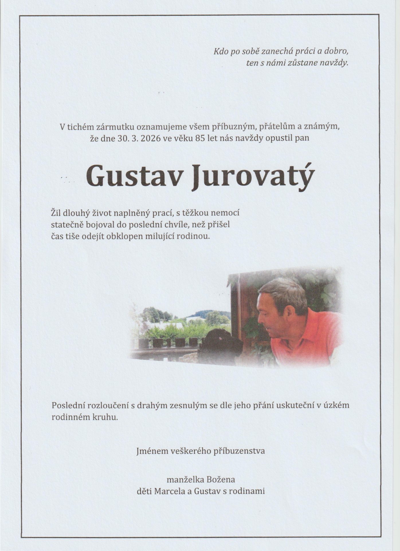 | 30.03.2026 | Gustav Jurovatý | Nové Město na Moravě | 85 let | Zobrazit |