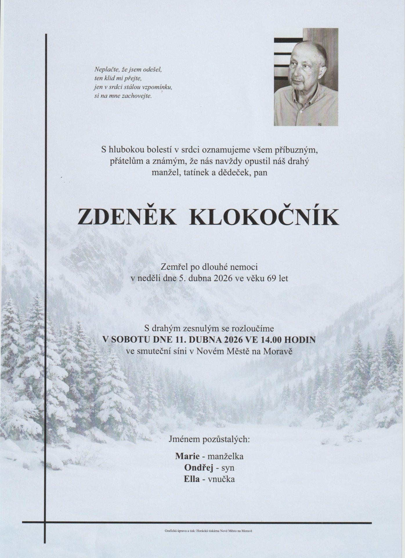 | 05.04.2026 | Zdeněk Klokočník | Nové Město na Moravě | 69 let | Zobrazit |